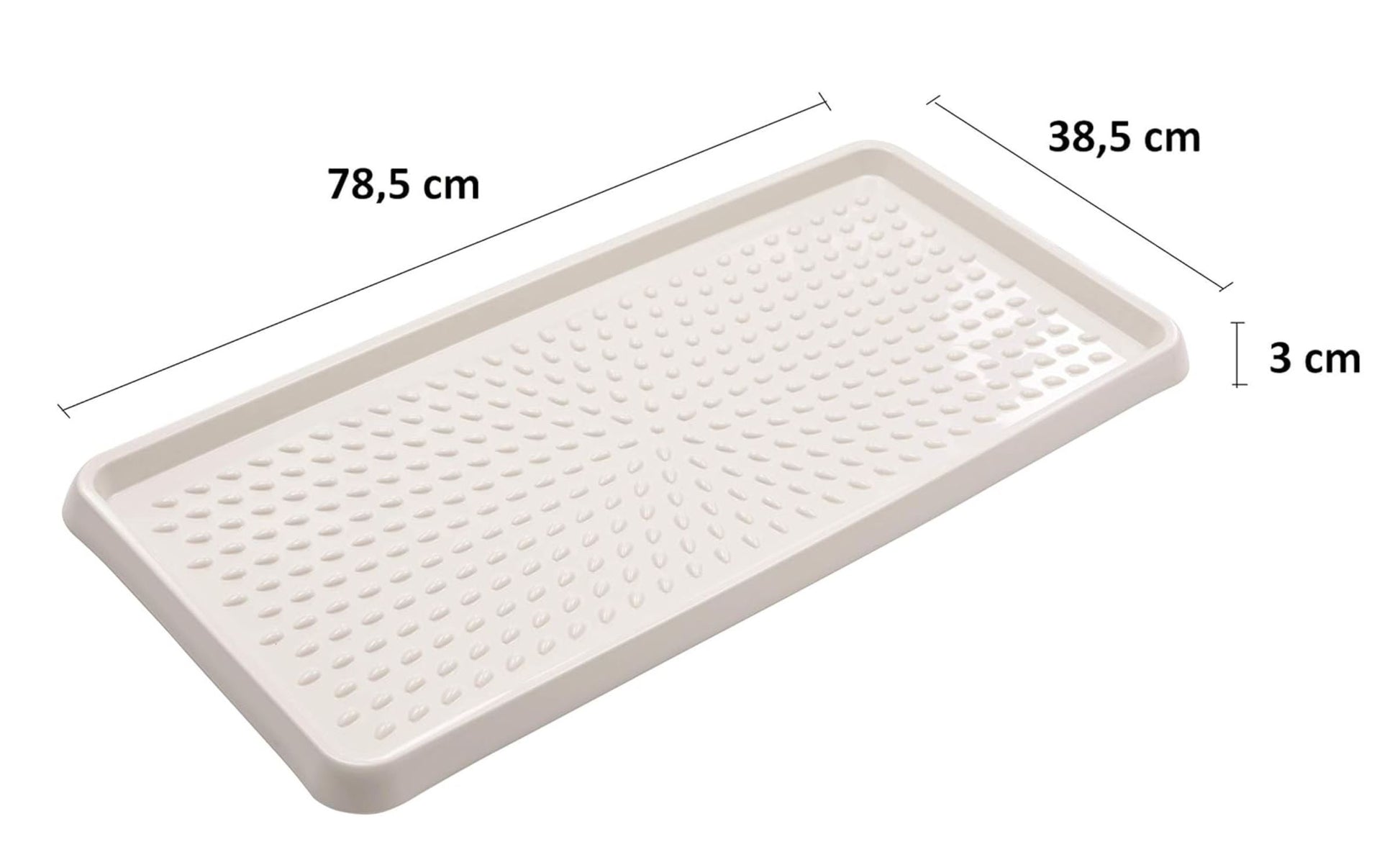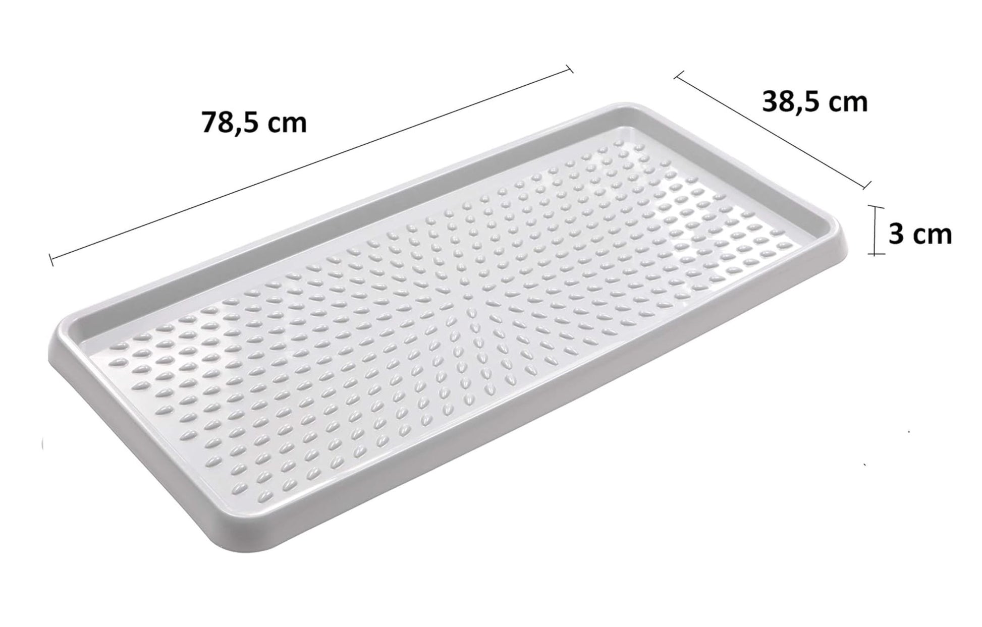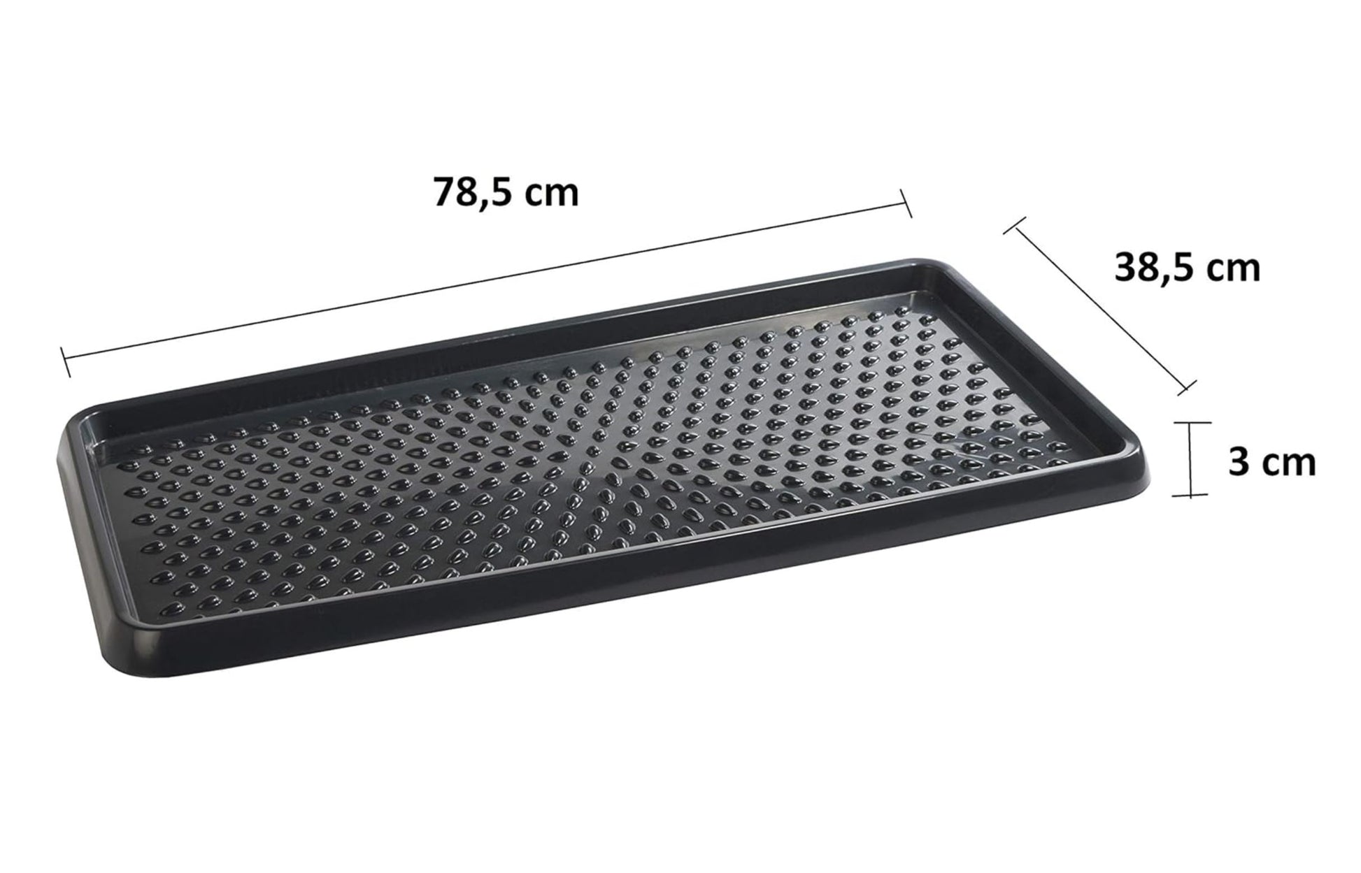 Dank des erhöhten Randes (3 cm) bleibt Feuchtigkeit sicher in der Schale eingeschlossen. Die strukturierte Oberfläche mit Noppen hebt die Schuhe leicht an und ermöglicht ein gleichmäßiges Abtropfen – für schnelleres Trocknen und weniger Nässe.