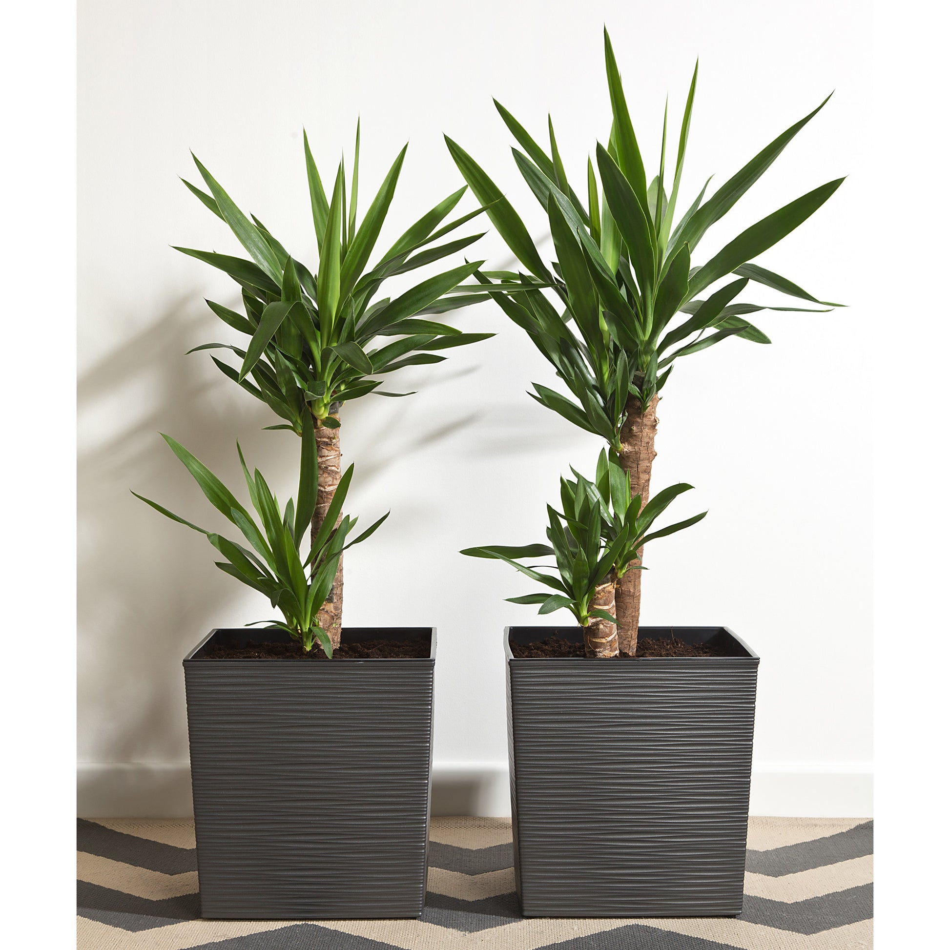 Der Juka wird aus robustem, UV-beständigem Kunststoff gefertigt. Er ist langlebig, leicht und pflegeleicht. Je nach Größe enthält der Topf einen schwarzen Inneneinsatz – bei den Größen 19 cm und 25 cm ohne Griffe, bei 30 cm und 40 cm mit praktischen Tragseilen aus Schnurmaterial für einfaches Herausnehmen.